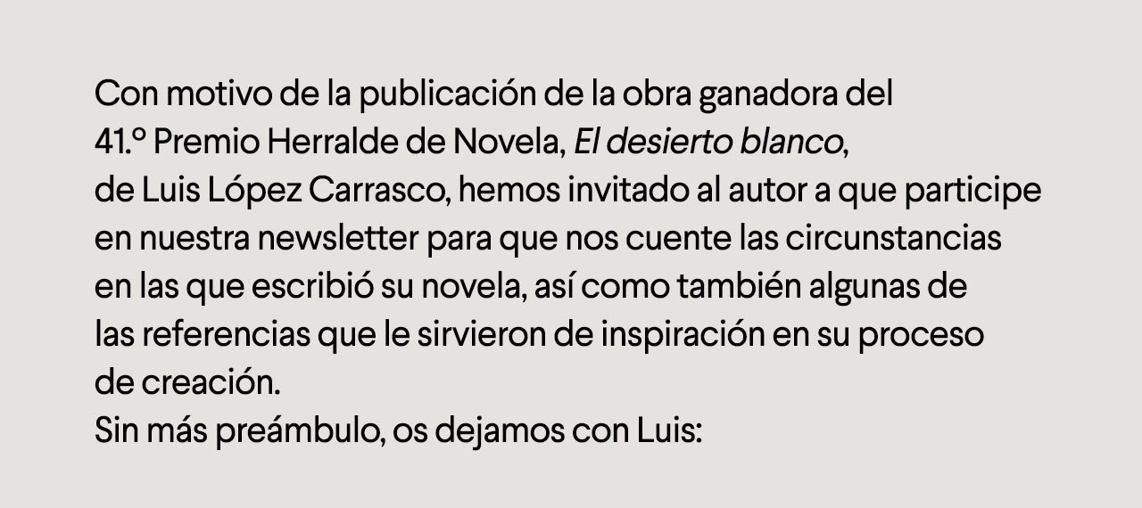 La imagen de portada del libro está tomada de una cuenta de Twitter, titulada «Soft landscapes», un bot diseñado por @v21 que genera paisajes tenues. Estas imágenes de riscos y cordilleras de tonalidades azules o violetas, cuyo horizonte está al borde de la desaparición, me acompañaron en la escritura del libro y me recuerdan a atardeceres de verano en los paisajes desérticos murcianos de las sierras de Carrascoy, Ricote, Espuña o las Moreras. Esa portada me recuerda también al trabajo de Stanley Donwood, colaborador habitual de Radiohead en el diseño de portadas y afiches. Algunos de sus trabajos también han inspirado este libro y nos traen de vuelta al año 2000, año de lanzamiento de Kid A, cuya canción «In Limbo» me acompañó en esos primeros años en Madrid, y que igual puede ser el verdadero punto de partida de esta novela. | | | | Esta semana publicamos el libro ganador del 41.º Premio Herralde de Novela, El desierto blanco, de Luis López Carrasco, quien os escribe hoy en esta newsletter. Una obra excepcional sobre una generación vista desde un tiempo y un espacio ajenos; sobre unos personajes que habitan un extraño territorio que los impulsa a confrontarse con lo que fueron y lo que son. También publicamos la obra que ha resultado finalista del galardón, La reina del baile, de Camila Fabbri, un libro que asalta al lector con la inusitada fuerza de su prosa, directa y sencilla… aunque solo en apariencia. Una narración que nos habla de traumas, realidades y deseos, y que ha sido descrita por Leila Guerriero como «una prosa que parece llegada del espacio exterior». Y, finalmente, esta semana publicamos en «La Bella Varsovia» Soo, de Juli Mesa, el libro ganador del I Premio Ana Santos Payán para proyectos de libros de poesía. Se trata de una «propuesta torrencial expandida entre géneros, que trabaja desde el lenguaje sobre la memoria y nuestro lugar en el origen», en palabras del jurado. Y también publicamos el poemario que se llevó el accésit del mismo premio: Violeta, de Aurora H. Camero, «una escritura profundamente política, engarzada en una constante reflexión sobre la identidad» que nos cuenta el viaje de una vida, en una historia en la que cabe ternura y emoción de aquello que se desea, y al mismo tiempo su crudeza y su violencia. | | | | | «Has ido a buscar las energías de la juventud a un lugar por donde el tiempo no ha pasado, pero donde a su vez ha pasado de golpe. Una mala combinación.» Luis López Carrasco, El desierto blanco | | | | | | Gracias por tus palabras, Luis. Un abrazo, ¡y hasta la próxima semana! | | | | |