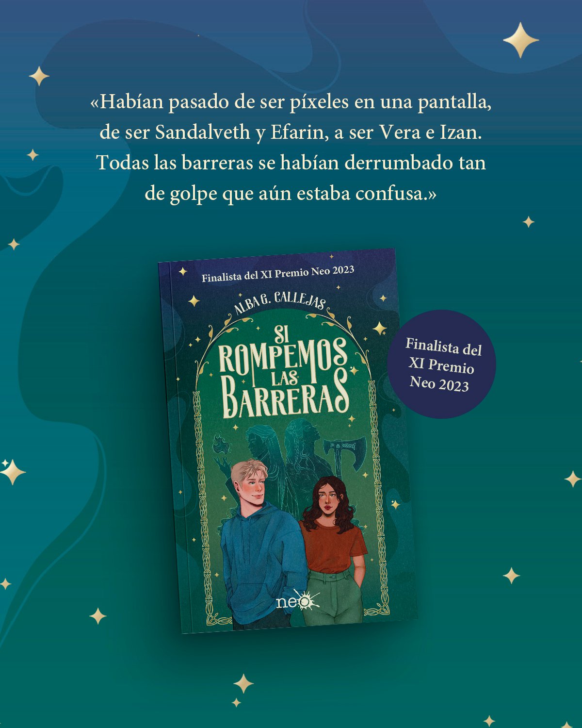 Encarnar la piel de la bárbara Sandalveth en Reinos de Alanar lo es todo para Vera. Sobre todo, cuando recorre el juego junto al hechicero Efarin, su mejor amigo, aunque solo lo conozca en aquel mágico mundo digital. Pero el destino nunca se comporta como uno quiere y el viejo ordenador de Vera se estropea en plena época de exámenes, apartándola de Efarin y todos sus planes. Por si fuera poco, Vera debe enfrentarse a una mudanza, al inicio de una nueva vida en Guadalajara y a su ingreso en el bachillerato de Artes sin su apoyo incondicional, Efarin. Este libro tiene: 💘 Romance 🙈 Primer amor 🎮 Videojuegos 👫 Amistad 📲 Relación a distancia