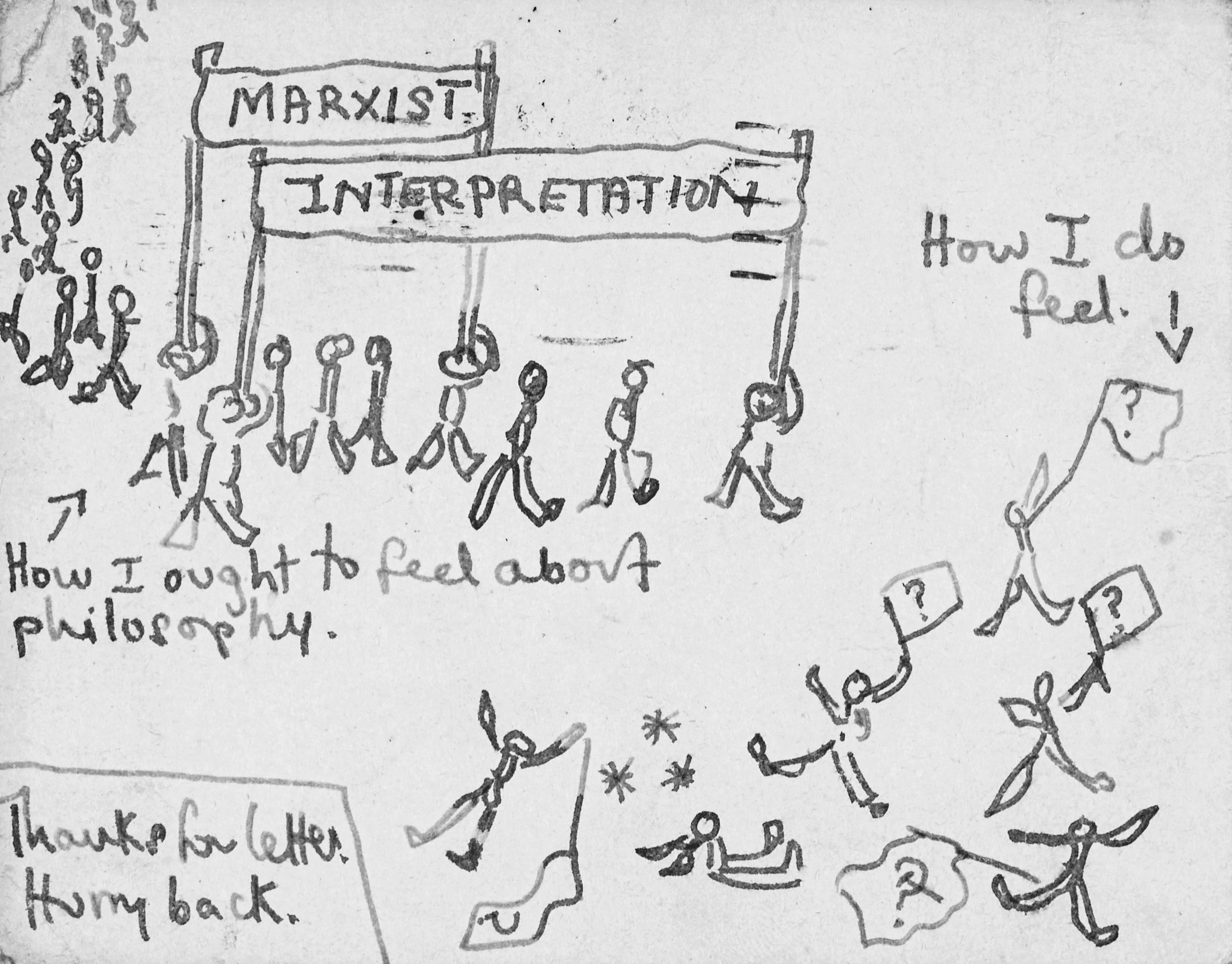 El grupo de amigas, rodeadas por otras mujeres que recuperaban espacios con la marcha de los hombres, rescataron materias del pensamiento como la ética y la moral, revindicando a su vez la importancia de la filosofía y de la trascendencia y redescubriendo algunos conceptos claves como «empatía» o «generosidad». Pero, sobre todo, lograron volver a introducir la metafísica y la poesía en el pensamiento, tal y como explican las autoras del libro: «A través de los ojos de esas amigas emerge una nueva imagen. Nuestro mundo familiar se transforma en un suntuoso tapiz con motivos que se entremezclan, tachonado de objetos culturales de poder metafísico y rebosante de vida vegetal, animal y humana. Y a nosotros, los individuos humanos cuyas vidas ayudan a crear y a preservar esos motivos y objetos, se nos vuelve a ver como la clase de animal cuya esencia debe cuestionarse, crearse y amarse. Somos animales metafísicos». | | | | Postal de Iris Murdoch enviada a Mary Scrutton (nombre de soltera de Mary Midgley) y dibujada a mano por la filósofa. | | | | Con motivo de la publicación del libro y coincidiendo con una efeméride muy especial, pues ayer se cumplían veinticinco años de la muerte de Iris Murdoch, la más conocida de las integrantes del grupo (aunque, curiosamente, la fama le llegó gracias a la ficción, principalmente por ser la autora de las novelas Bajo la red y El mar, el mar, escritas en 1954 y 1978 respectivamente), reivindicamos la obra del Cuarteto y de aquello que las unía: el espíritu crítico, el amor por la filosofía y una profunda amistad. | | | | Esta semana publicamos en «Narrativas hispánicas» Los guapos, la nueva novela de Esther García Llovet tras Spanish Beauty. Una especie de Twin Peaks castizo –como si Stephen King escribiese sobre la Albufera–, en la que un falso periodista acude a un camping para investigar unos misteriosos círculos que, aparentemente, han hecho los extraterrestres. Divertida, excéntrica y genial. En Tecnología y barbarie, el argentino Michael Nieva, autor de La infancia del mundo, revisa el binomio que da título al libro a través de la historia del pensamiento y de la literatura latinoamericanas, en una serie de ensayos recogidos en un volumen que publicamos en «Argumentos». Ternura y derrota, publicado en La Bella Varsovia, es el primer acercamiento de Luna Miguel a la dramaturgia: un texto que la autora llevó a escena en 2021 dentro de la programación de la Compañía Nacional de Teatro Clásico, interpretado por ella misma. Un monólogo que puede leerse como una ficción egoísta sobre el poder, como una epístola florida al deseo, como un ensayito atormentado o como un largo poema en la búsqueda incesante del amor. Además, llega en formato audiolibro En el camino, de Jack Kerouac, un libro que fue la biblia y el manifiesto de la Generación Beat y que se ha convertido en una novela de culto y en un clásico de la literatura norteamericana. Narrado por Ignasi Burniol. | | | | Píldoras para estar al día | | | | -